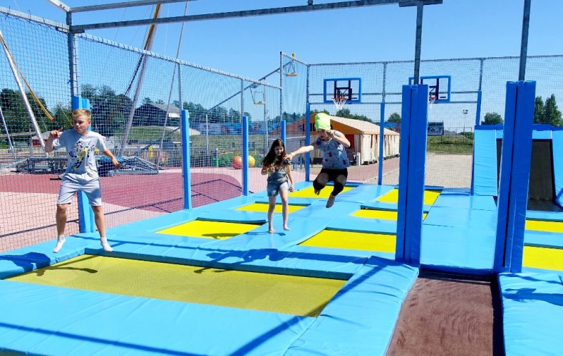 Батутный комплекс подходит для детей от 3 лет и взрослых с ограничением по весу до 100 кг. Батут имеет ширину 10 м и длину 15 м, а его прыжковая зона разделена на 16 секций, поэтому одновременно на нем могут заниматься 8 посетителей. Батуты также имеют новые и интересные функции, такие как две наклонные поверхности и баскетбольные кольца.